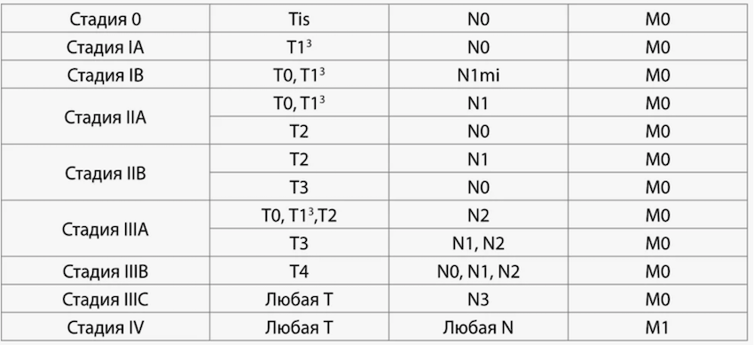• T – опухоль (Т1 – до 2 см, Т2 – 2-5 см, Т3 – больше 5 см, Т4 – любой размер воспалительный отечный, с прорастанием в грудную клетку и/или кожу