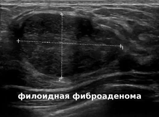Симптомы: Заболевание сначала развивается без видимых признаков, но с течением времени можно обнаружить опухоль при прощупывании, которая ощущается как плотное безболезненное образование размером от 1 до 2 см. В поздних стадиях опухоль может увеличиться до 35 см и стать заметной визуально — грудь увеличивается в объеме, её поверхность становится неровной, а под кожей отчетливо видны крупные кровеносные сосуды. Филлоидная фиброаденома способна увеличиваться в размере за несколько недель или месяцев, достигая 3 см и более.