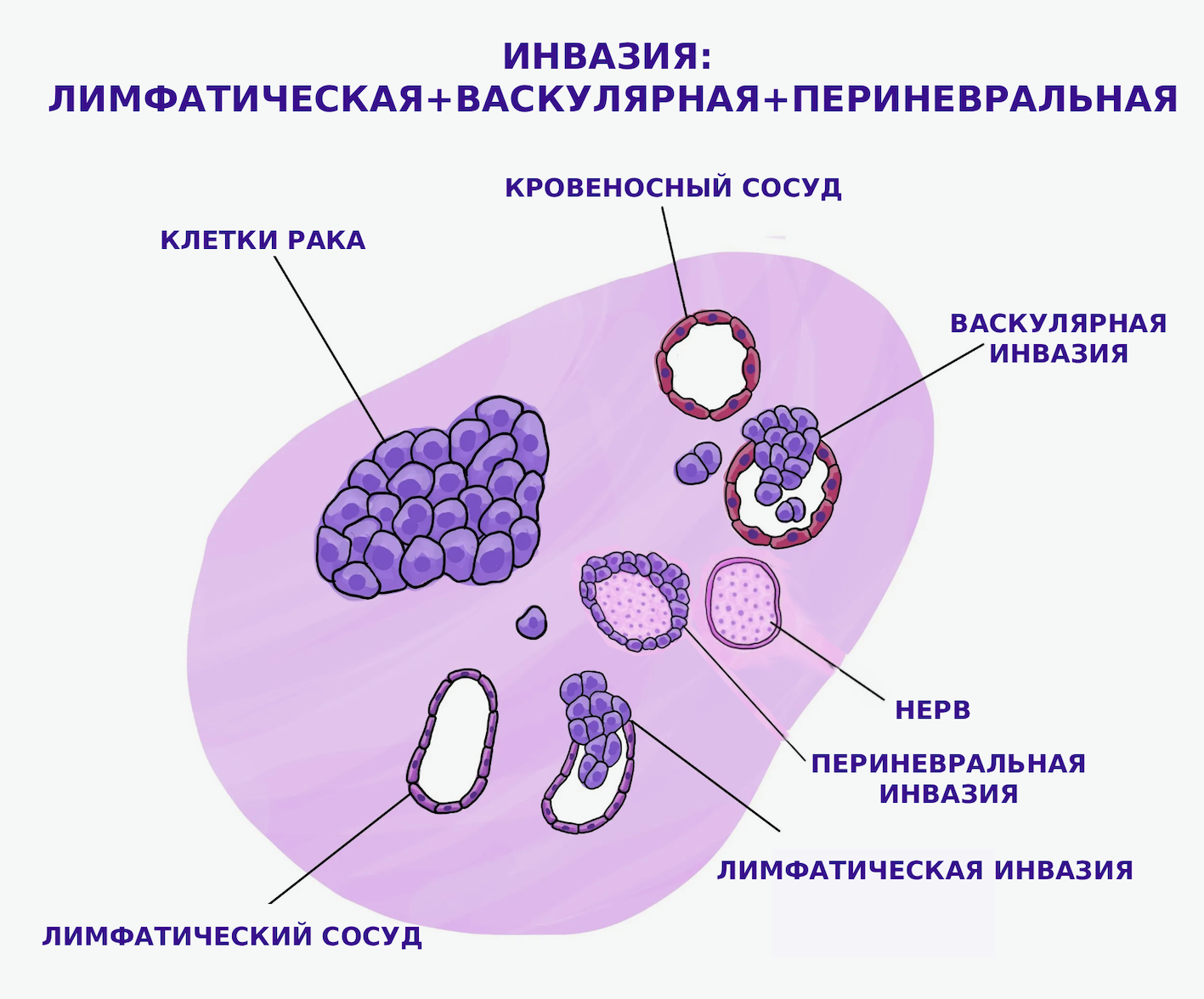 Лимфатическая инвазия — раковые клетки проникают в лимфатические сосуды, что может предшествовать распространению на лимфатические узлы, которые дренируют ткань, в которой возникла опухоль.